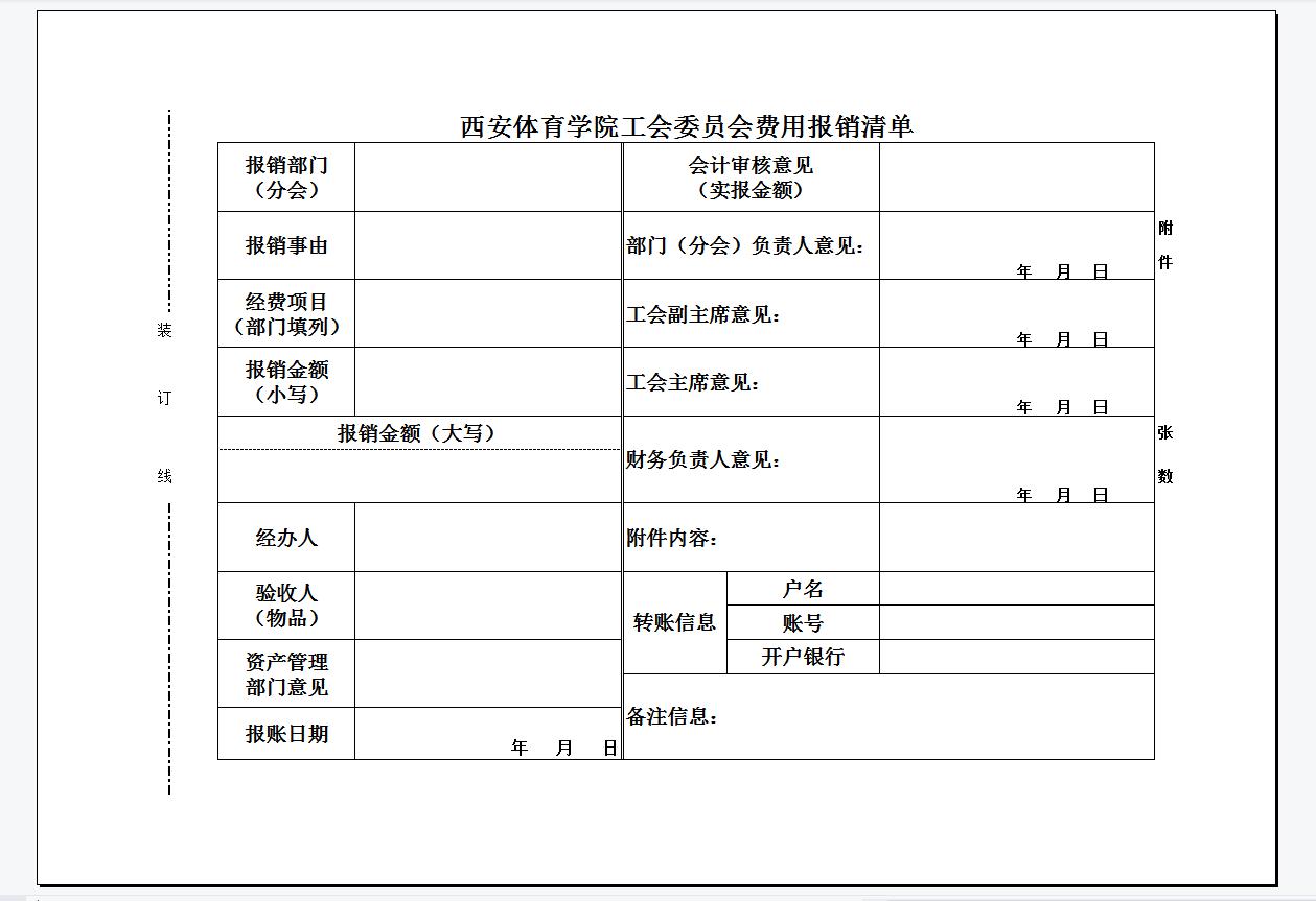 西安体育学院工会委员会费用报销单