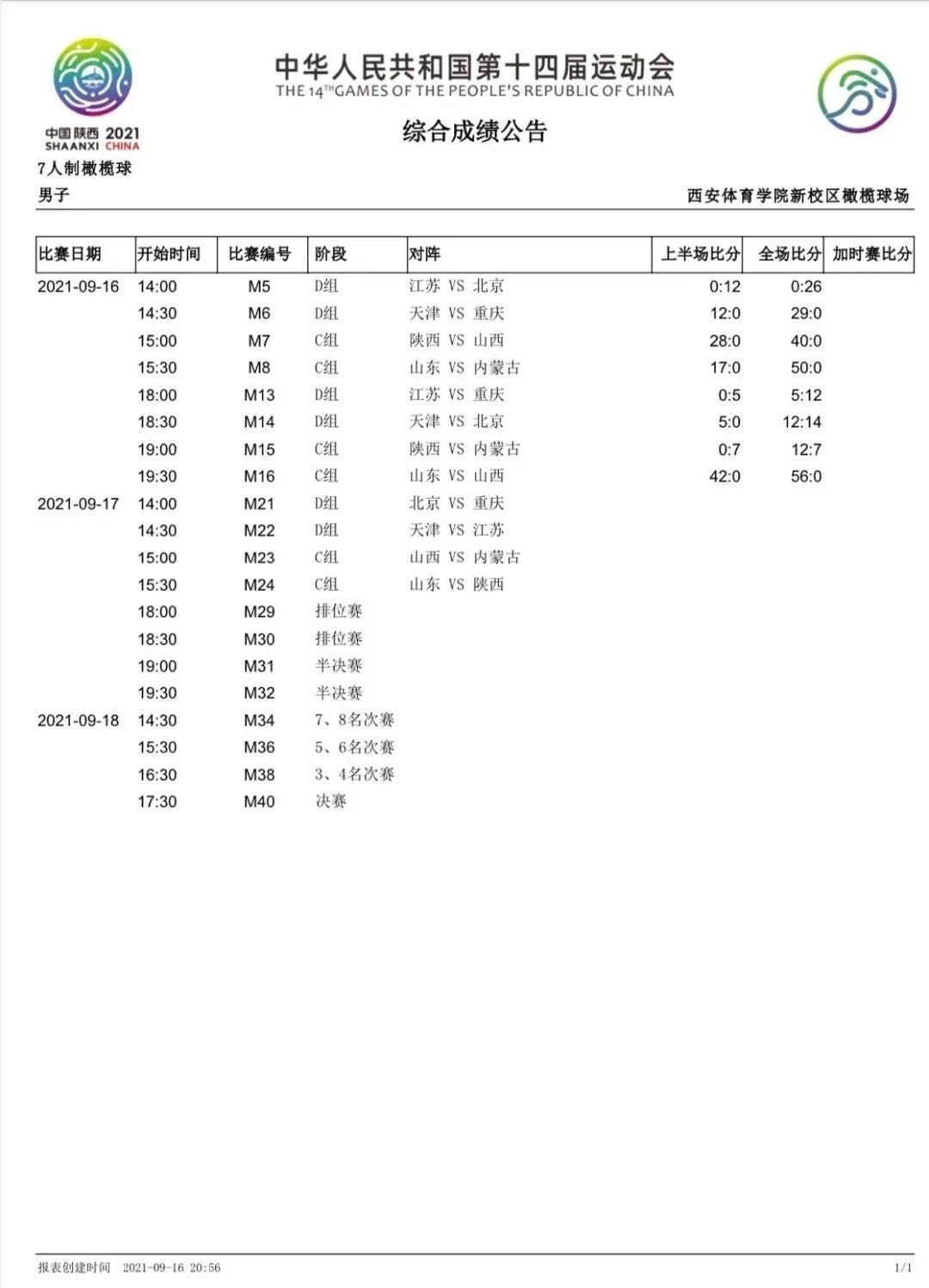 9月16日,第十四届全国运动会7人制橄榄球比赛在西安体育学院新校区橄榄球场开赛。本次比赛有来自全国10个省市的16支参赛代表队角逐男、女项目金牌。