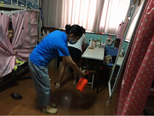 (一)后勤管理处(集团)学生公寓管理中心在对工作人员进行体温检测、登记后,严格按照校医院《学生公寓消毒指南》要求做好学生公寓清洁、消毒每日2次,通风工作每日3次,每次30分钟,以及学生体温检测工作。