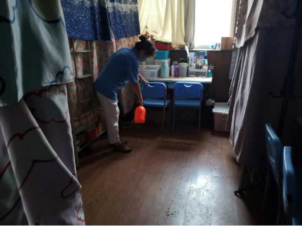 (一)后勤管理处(集团)学生公寓管理中心在对工作人员进行体温检测、登记后,严格按照校医院《学生公寓消毒指南》要求做好学生公寓清洁、消毒每日2次,通风工作每日3次,每次30分钟,以及学生体温检测工作。