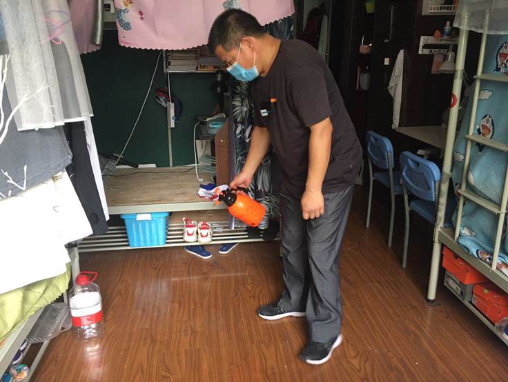 (一)后勤管理处(集团)学生公寓管理中心在对工作人员进行体温检测、登记后,严格按照校医院《学生公寓消毒指南》要求做好学生公寓清洁、消毒每日2次,通风工作每日3次,每次30分钟,以及学生体温检测工作。