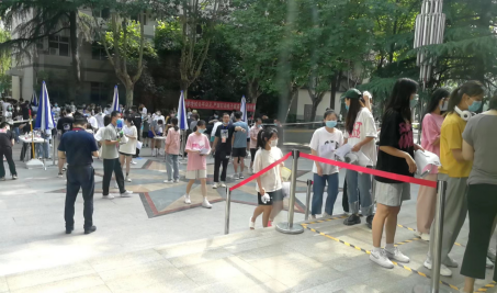 考试期间,工作人员全程佩戴口罩,在教学楼门口对进入考场的师生进行测温,维护考场内外秩序,引导考生按照要求进入考场,考试全部结束后,保洁人员对各考场进行卫生清洁、消杀通风等工作,保障教室后续安全使用。