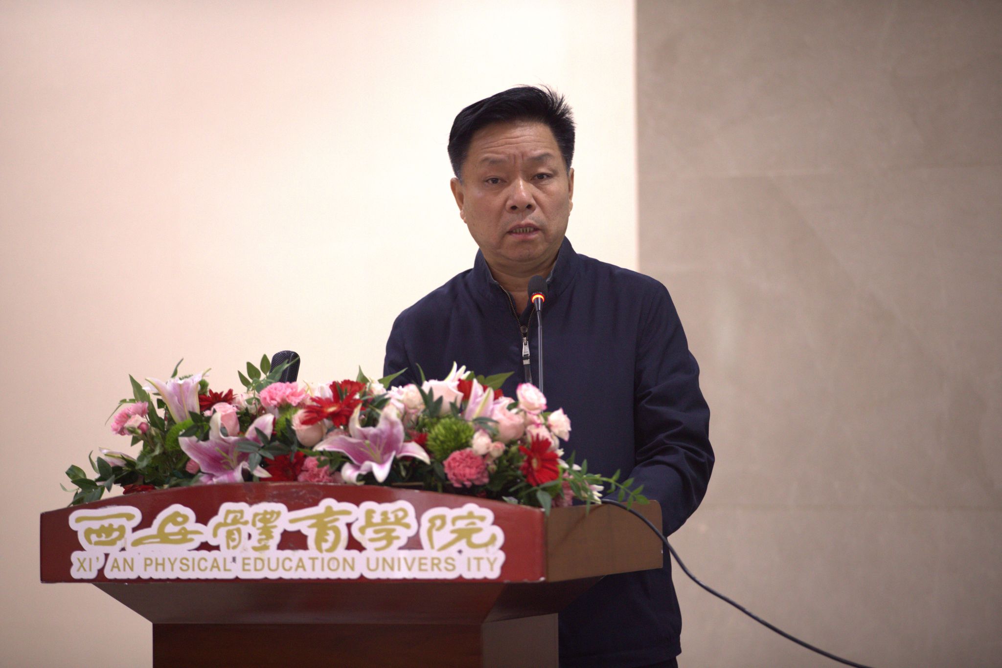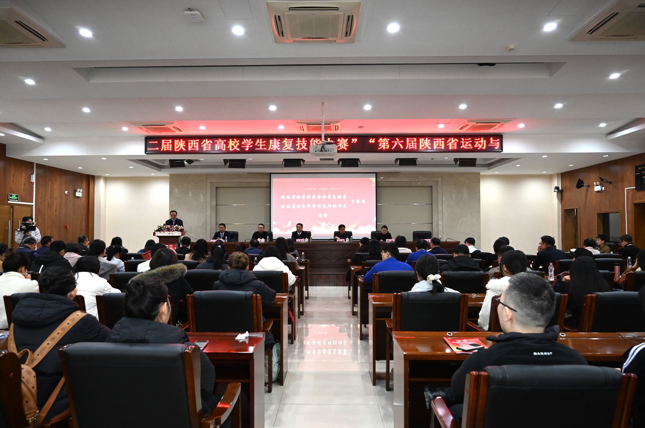 本网讯 11月30日,第六届陕西省运动与健康促进论坛暨陕西省第二届高校学生康复技能大赛在我校含光校区举办。陕西省体育局副局长徐鹏、我校党委副书记马海涛、陕西省体育局科教处副处长甄颖、陕西省体育科学研究所副所长于俊海、我校人事处处长刘涛等领导与嘉宾出席开幕式。开幕式由运动与健康科学学院院长刘军主持。