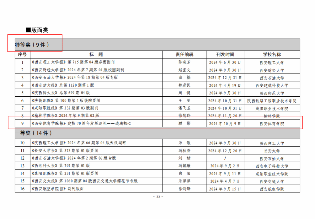 本网讯 日前,陕西高校校报研究会公布了2024年度“陕西高校新闻奖”评选结果,我校2件作品获奖。其中《〈西安体育学院报〉建校七十周年发展巡礼——追溯初心》获得版面类特等奖,顾彬、田芊伊、王锦婷撰写的《七秩新西体 奋进新征程——我校举行建校七十周年高质量发展大会》获得通讯类二等奖。