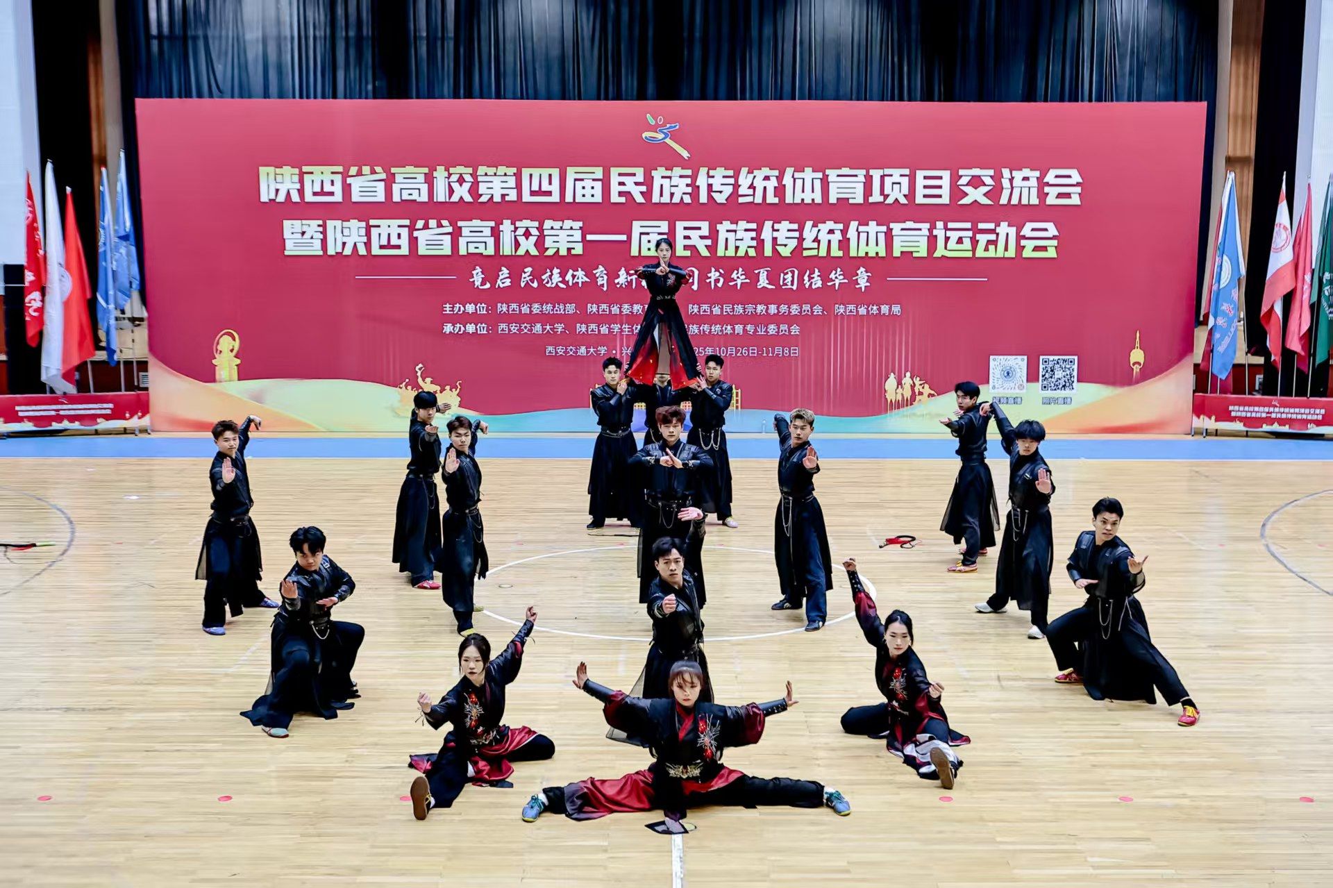 本网讯 11月8日,由陕西省委统战部、省委教育工委、省民族宗教事务委员会、省体育局联合主办的陕西省高校第四届民族传统体育项目交流会暨陕西省高校第一届民族传统体育运动会在西安交通大学兴庆校区举行,共有全省52所高校的1250名运动员同台竞技。我校武术学院的集体武术表演《秦风武韵》凭借其精湛的技艺和深厚的文化内涵,在众多参赛节目中脱颖而出,荣获表演项目一等奖。