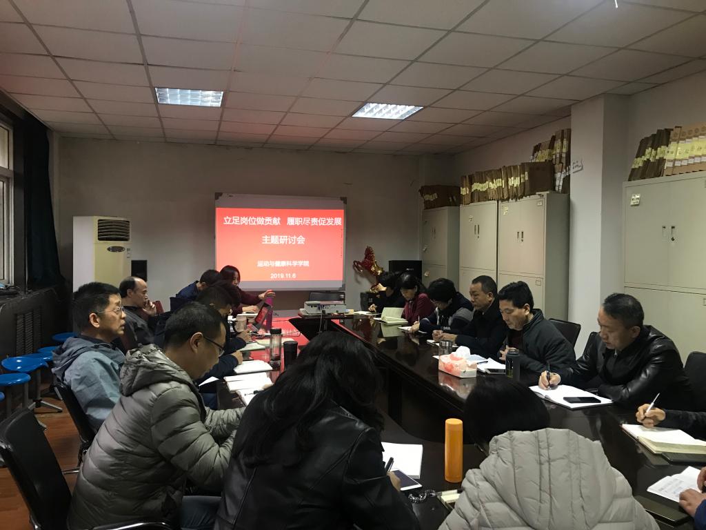 2019年11月6日下午四时,我院在实验楼五楼会议室召开运动与健康科学学院立足岗位做贡献 履职尽责促发展主题研讨会。运动与健康科学学院党委书记刘勇主持,运动与健康科学学院刘涛副院长、运动医院院长何昌谋以及全院各教研室主任、副主任、各支部书记、各教研室教师代表参加。
