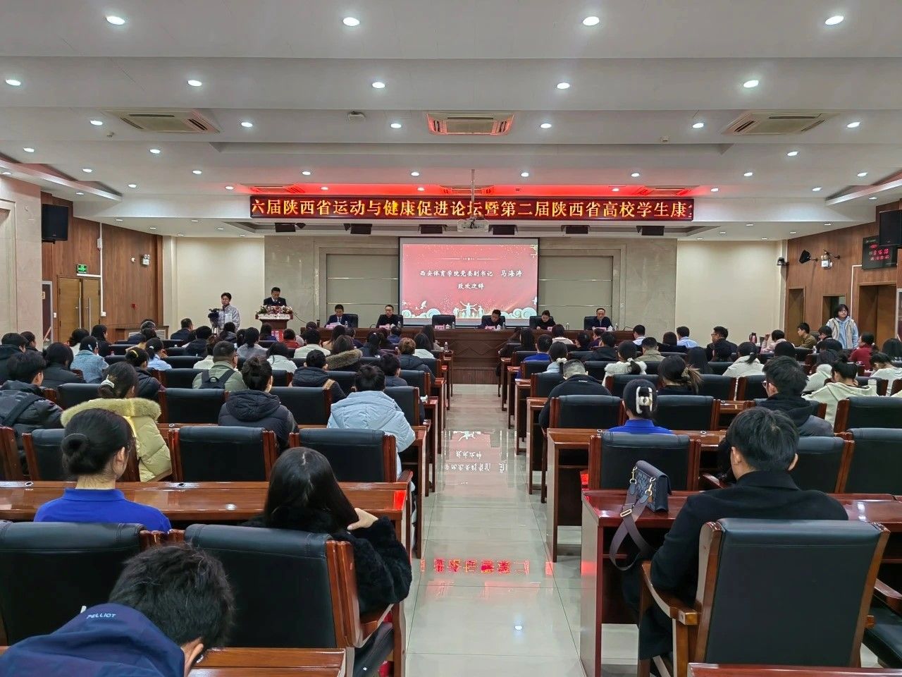 陕西省体育局副局长徐鹏、西安体育学院党委副书记马海涛、陕西省体育局科教处副处长甄颖、陕西省体育科学研究所副所长于俊海、西安体育学院人事处处长刘涛等领导与嘉宾出席开幕式。开幕式由运动与健康科学学院院长刘军主持。