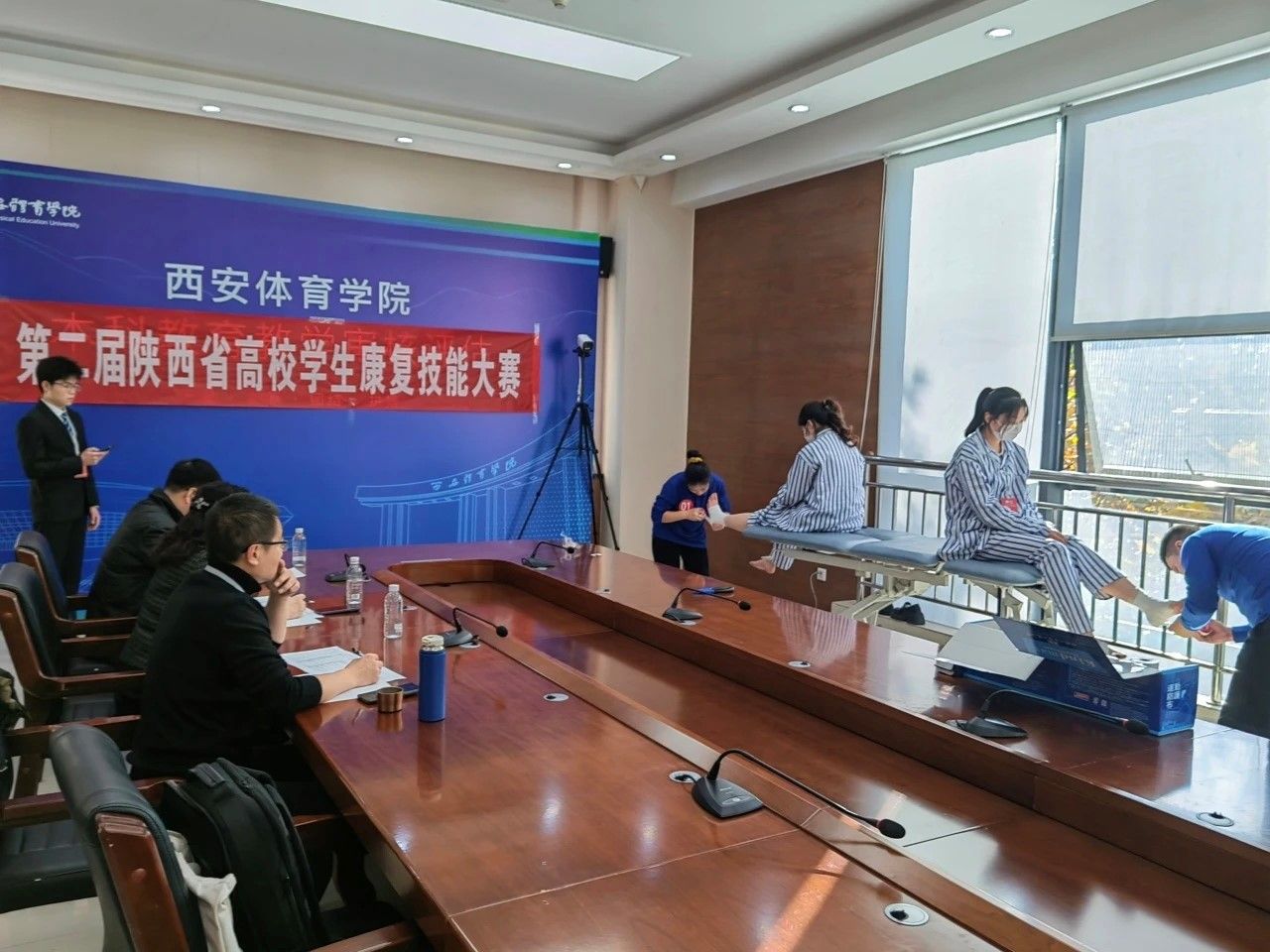 本次康复技能大赛从编篮式贴扎、心肺复苏和团体项目三个模块对选手进行全面考察。陕西省设有相关专业的陕西学前师范学院、安康学院、商洛学院、西安交通大学城市学院、延安大学西安创新学院、西安翻译学院、西安外事学院、西安思源学院、安康职业技术学院、西安体育学院等10所院校50余名师生参加了本次比赛。比赛通过同步转播的方式供所有参赛师生观摩、学习和监督,赛后举行了隆重的颁奖仪式,本次比赛圆满落幕。