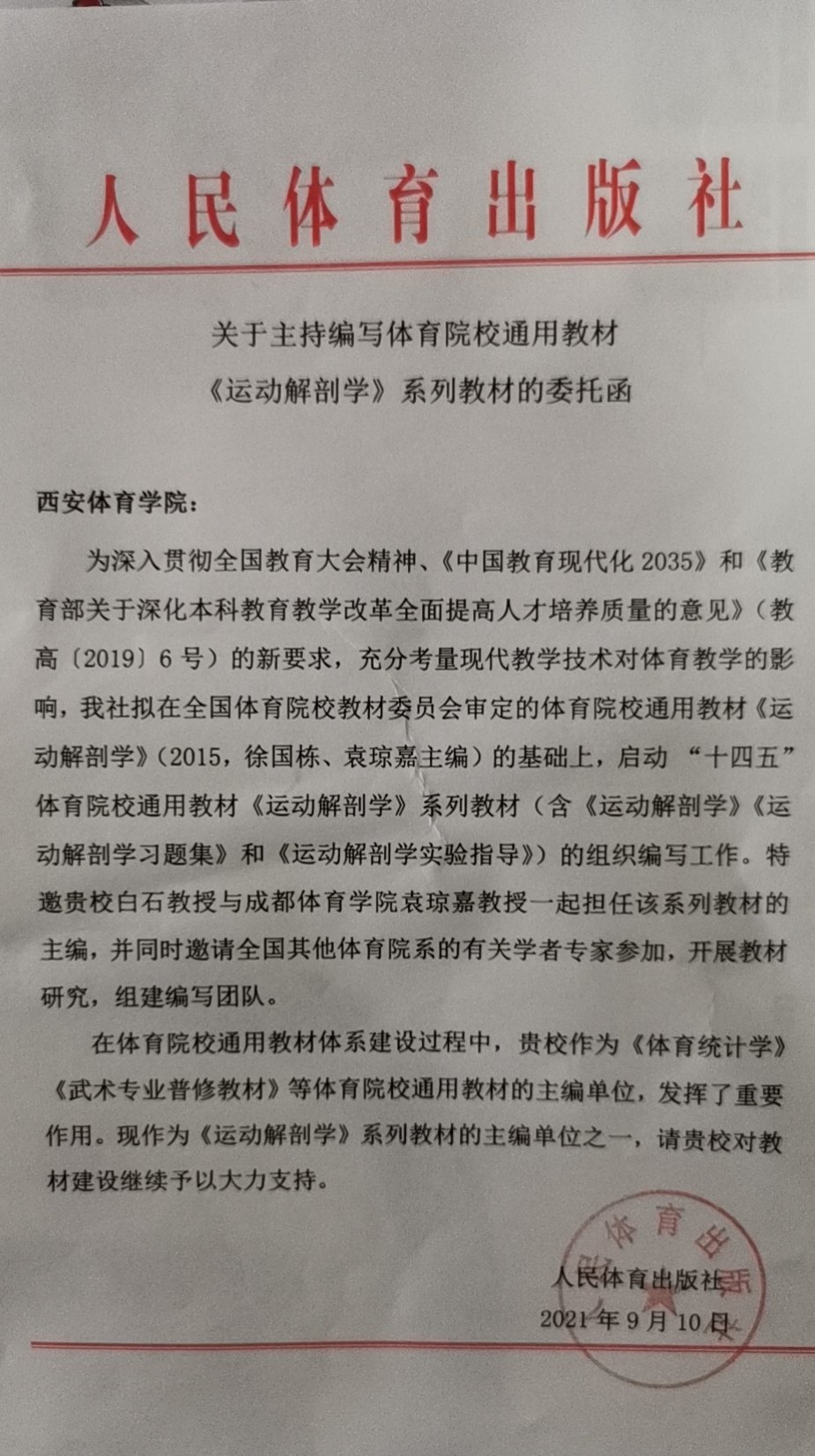 近日,人民体育出版社发来关于主持编写体育院校通用教材《运动解剖学》系列教材的委托函,特邀我校运动与健康科学学院白石教授与成都体育学院袁琼嘉教授一起担任该系列教材的主编,此为我校“十四五”规划教材建设的开门红,也标志着我校教材建设事业上了一个新台阶。