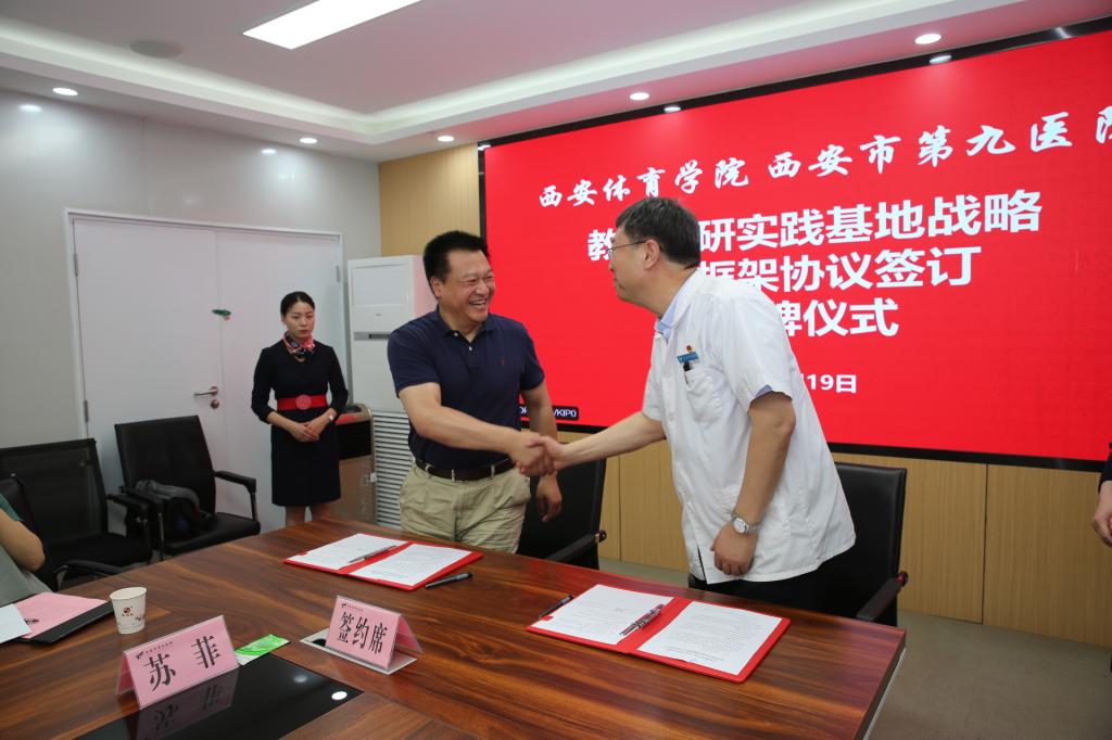 为贯彻落实教育部、陕西省教育厅关于高校书记校长访企拓岗促就业专项行动的部署和要求,进一步促进校企合作和毕业生更加充分更高质量就业,与此同时为服务陕西体医融合事业发展,加强西安市第九医院与我院康复专业、心理专业等在医、教、研方面的合作,充分发挥院校与医疗机构的优势,为高校、医院培养更多高素质、高技能的复合应用型人才。5月19日,西安体育学院与西安市第九医院战略合作框架协议签约及揭牌仪式在市九院一号会议室举行。