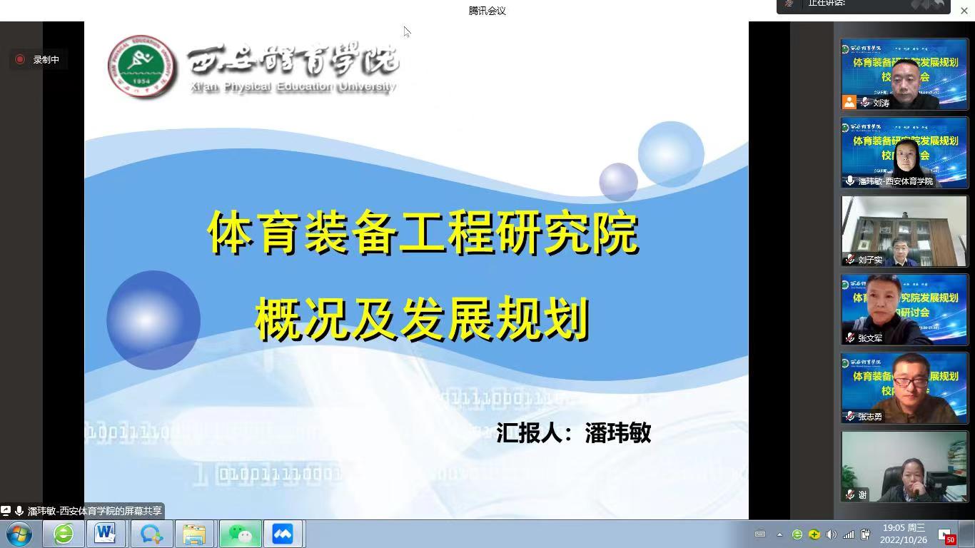 西安体育学院体育装备工程研究院是在建设“健康中国、体育强国”,高校积极开展科技创新的大背景下,学校领导高瞻远瞩、未雨绸缪,根据我校发展现况新建的一个科研学术平台。刚刚胜利闭幕的二十大明确提出要实施科教兴国战略,强化现代化建设人才。为了深入贯彻党的二十大精神,紧密结合我校体育装备工程研究院现有状况,有效促进体育装备工程研究院未来良性发展,运动与健康科学学院决定举办此次线上研讨会。历时三小时的会议中,与会领导、专家及骨干教师围绕研究院执行院长潘玮敏教授及张志勇老师汇报的体育装备工程研究院的发展宏观规划及具体实施方向展开热烈讨论。大家就研究院未来发展的细化目标,学科优势及已有研究成果,强化成果转化、规划制定细则等提出了很多宝贵的意见和建议。