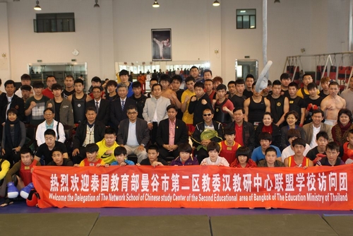 会上,SOMYOS SIRIBAN先生对辖区重点中学进行了详细介绍。苏明理院长与SOMYOS SIRIBAN 先生签署了就交换教师、学生等项目的友好协议。之后,访问团在武术系主任马文国的带领下,观看了我院武术系学生的精彩表演及散打比赛表演。