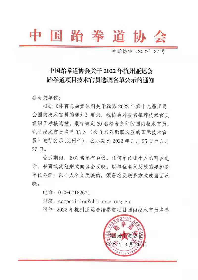 根据《国家体育总局竞体司关于选派2022年第十九届亚运会国内技术官员的通知》要求,本届亚运会跆拳道项目国内技术官员的选派由中国跆拳道协会组织,所选拔的裁判员需要具备具有良好的职业道德,能够秉公执法、公正康洁,严格遵守各项规定,严肃、认真、准确地履行裁判员职责;能够理解并熟练运用跆拳道竞赛规则和裁判法,具有较高的裁判理论水平和丰富的实践经验,具有全面竞赛的裁判工作能力和良好的外语水平。最终经过笔试和英文面试两轮考核在全国范围内选拔出30名国内技术官员。
