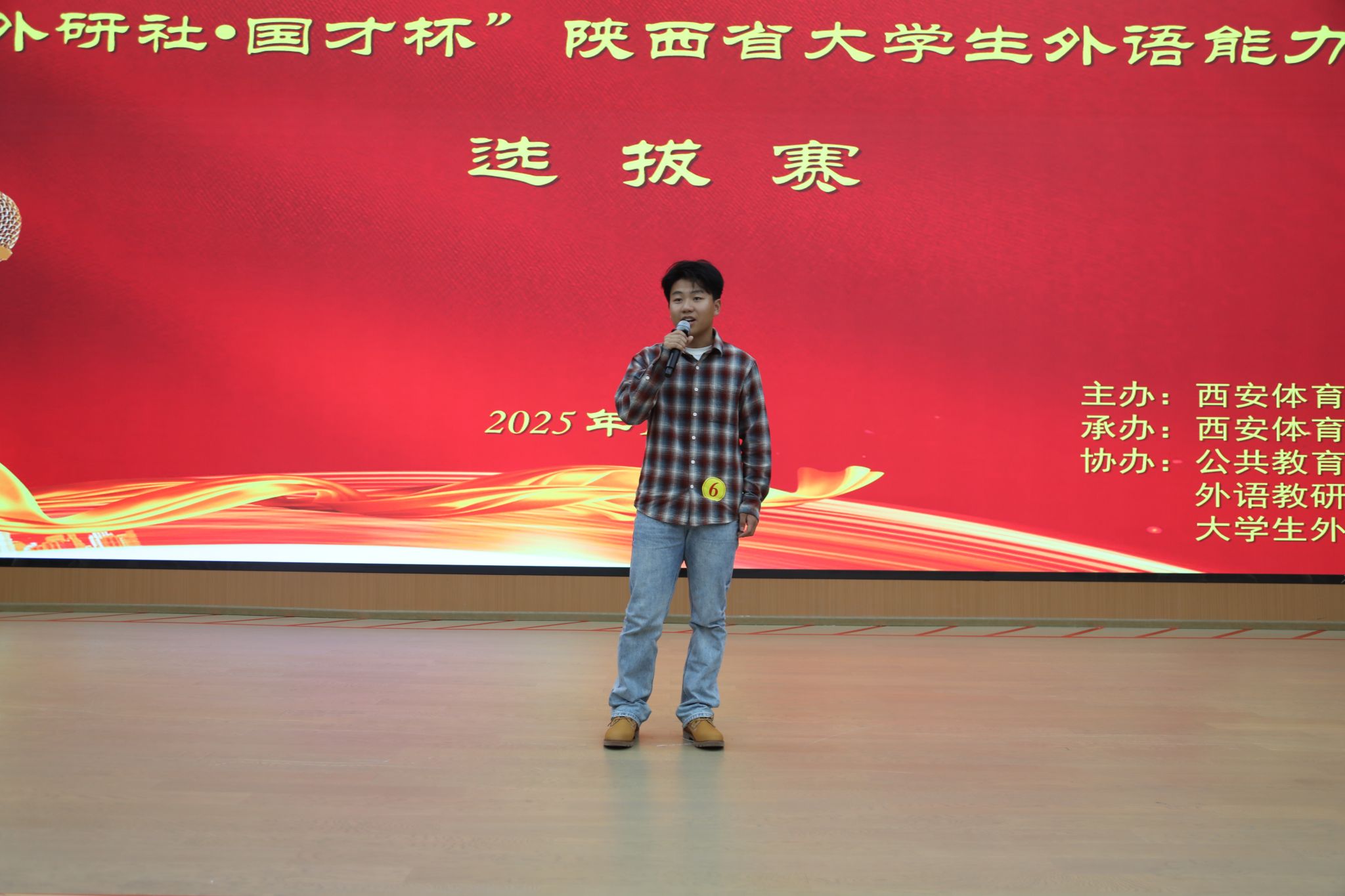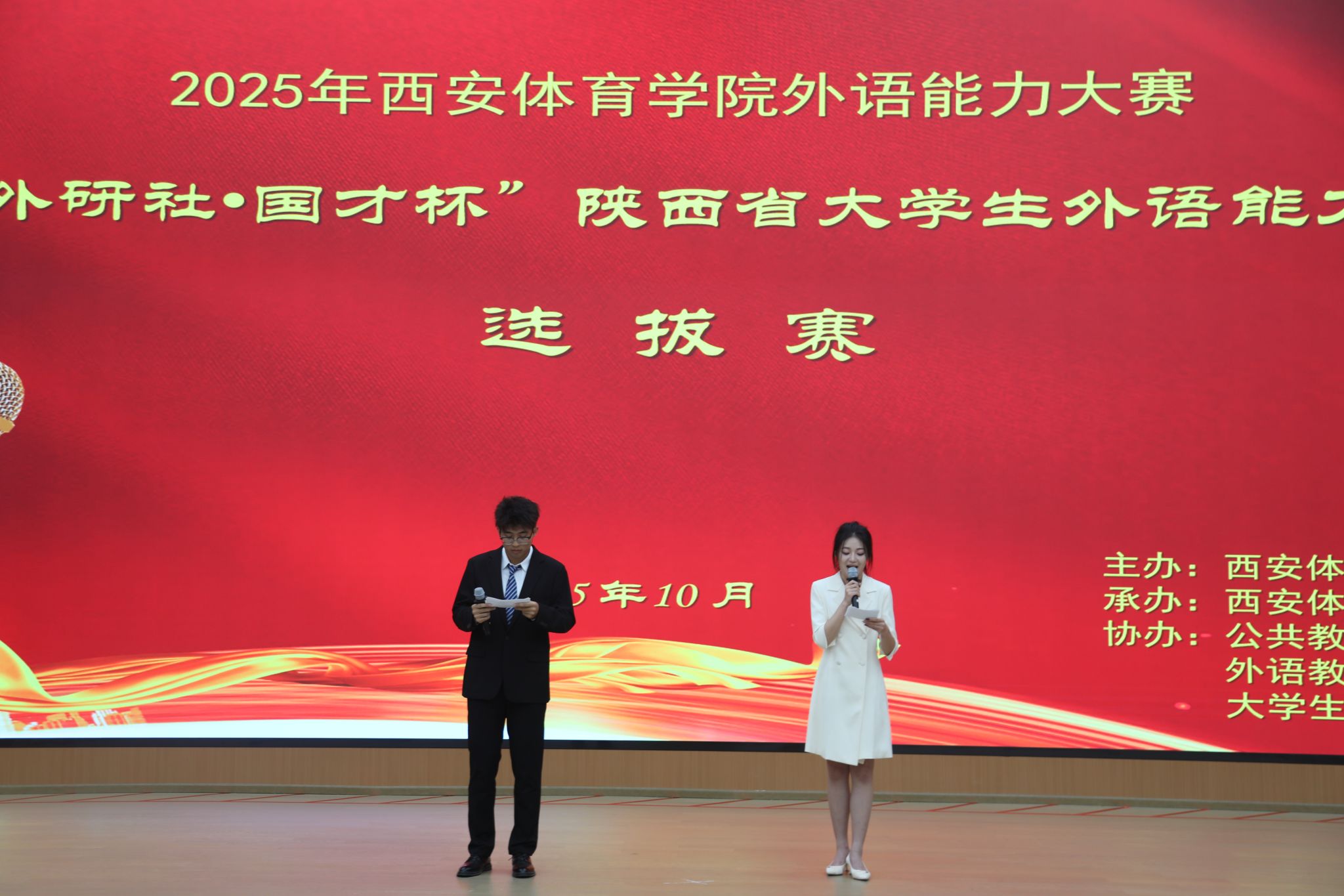 10月11日下午,2025“外研社·国才杯”陕西省大学生英语能力大赛西安体育学院选拔赛决赛在鄠邑校区隆重举行。本次比赛由教务处主办,校团委承办,公共教育学院外语教研室及大学生英语社团协办,旨在开展英语实践,提升学生学习英语的兴趣,选拔优秀选手晋级省赛,展示学校外语教学成果,培养兼具语言能力与国际视野的体育人才。