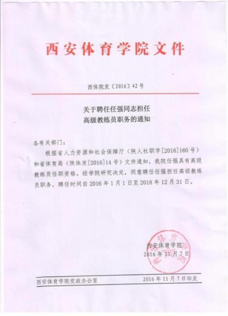 关于聘任任强同志担任高级教练员职务的通知