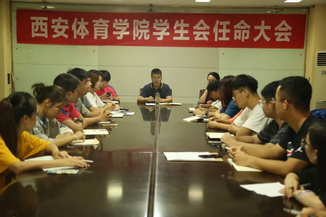 2019年9月9日下午18:00,西安体育学院学生会主席团任命大会在团委召开。团委副书记熊辉、团委老师雷云、团委老师董鹏举、学生会主席团与学生会各部门负责人参与本次会议,本次会议由团委老师董鹏举主持。