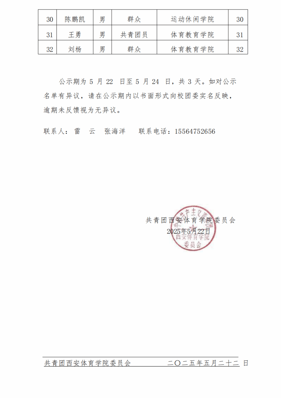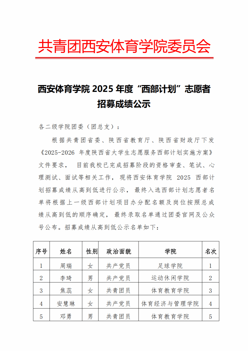 西安体育学院2025年度“西部计划”志愿者招募成绩公示