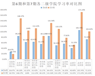 在本期与上一期的“青年大学习”参与率对比图中研究生部团委(↑1.52%),足球学院团委(↑2.66%)学习率较上一期相比有所增长,竞技体育学校团委总支(↓18.75%),艺术学院团委(↓4.88%),体育经济与管理学院(↓21.57%),体育新闻与传媒学院团委(↓10.41%),体育教育学院团委(↓11.70%),运动训练学院团委(↓8.64%),运动休闲学院团委(↓1.50%),运动与健康科学学院团委(↓46.12%),武术学院团委(↓11.64%),学习率较上一期相比有所下降。
