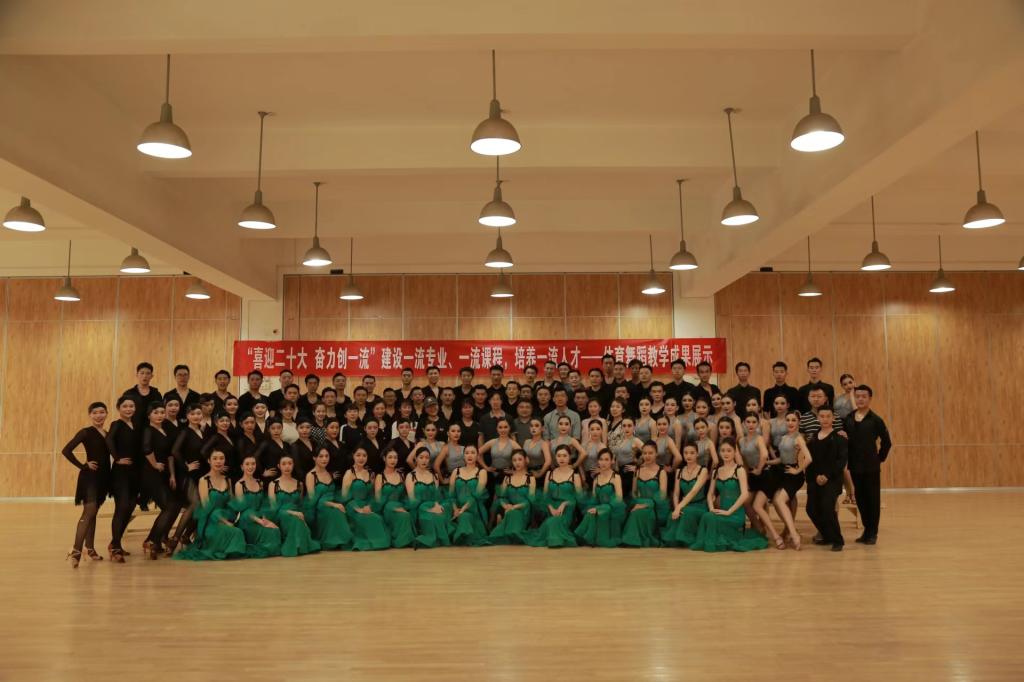 为贯彻落实立德树人根本任务,加快教育高质量发展,培养德智体美劳全面发展的社会主义建设者和接班人,以实际行动迎接党的二十大胜利召开等2022年教育工作具体要求,进一步推动“双一流”建设,全面振兴本科教育,提高高校人才培养能力,实现高等教育内涵式发展。艺术学院体育舞蹈教研室于2022年6月17日在艺术馆举办了以“喜迎二十大 奋力创一流”建设一流专业、一流课程,培养一流人才为主题的教学成果展示,以提高教育教学质量、提升学生综合素质为目标,用舞蹈表演专业2019级体育舞蹈方向学生专业汇报展演的形式检验教学成果。西安体育学院副校长刘新民,西安体育学院艺术学院党委书记丁雪艳,艺术学院副院长刘强,以及艺术学院各教研室老师莅临现场。