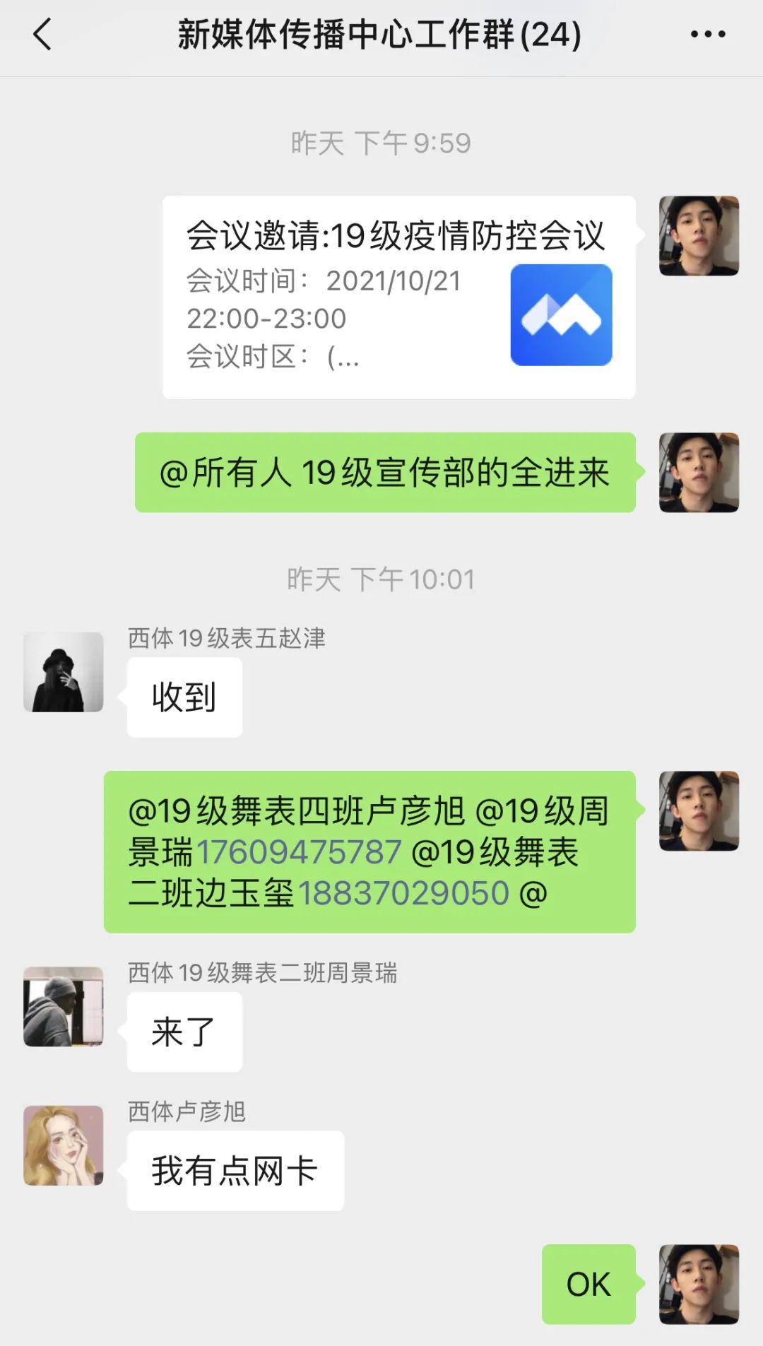 10月21日晚,艺术学院2019级师生通过软件进行疫情防控专题线上会议,会议由2019级辅导员赵静雯主持,全体学生干部、党员、入党积极分子参与会议。