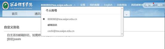 第三步:自主添加别名成功。例如:ceshi@tea.xaipe.edu.cn与808080@tea.xaipe.edu.cn为拥有不同名称的同一邮箱,此后您可使用以上两名称中的任意一个收发邮件。