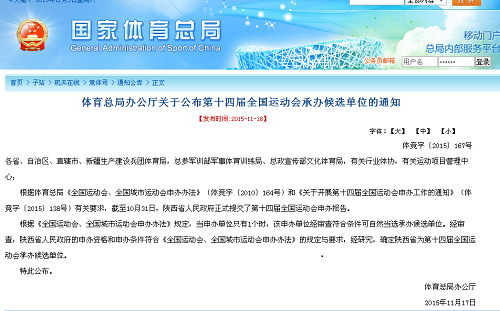 11月18日,西部网记者从国家体育总局官网获悉,截至10月31日,陕西省人民政府正式提交了2021年第十四届全国运动会申办报告。由于第十四届全国运动会有仅只有陕西省一个申办单位,陕西省将自然成为唯一一个承办候选单位。