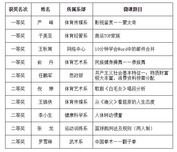 西安体育学院2016年院级微课教学比赛暨陕西省第二届高校教师微课教学比赛院内选拔赛获奖名单