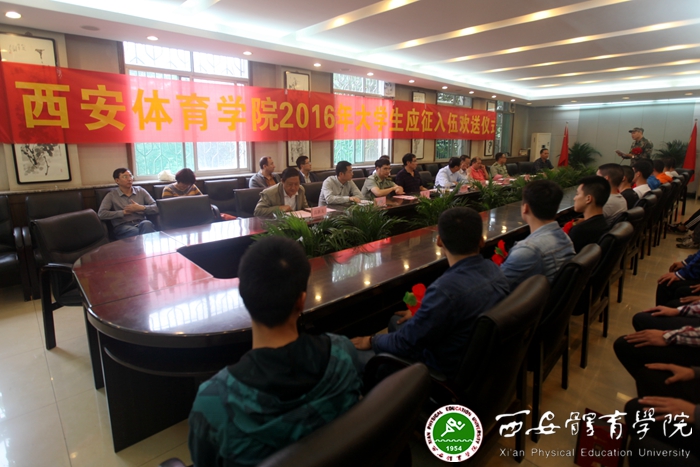 本网讯 9月20日上午,我院在行政楼二楼大会议室隆重举行2016年大学生应征入伍欢送仪式。党委副书记朱元利、副院长白跃世、各职能部门负责人以及相关各系党总支书记和应征入伍的大学生50余人参加,受邀参加的还有西安市碑林区武装部政委肖军、军事科参谋贠鹏,欢送仪式由院武装部部长雷振华主持。