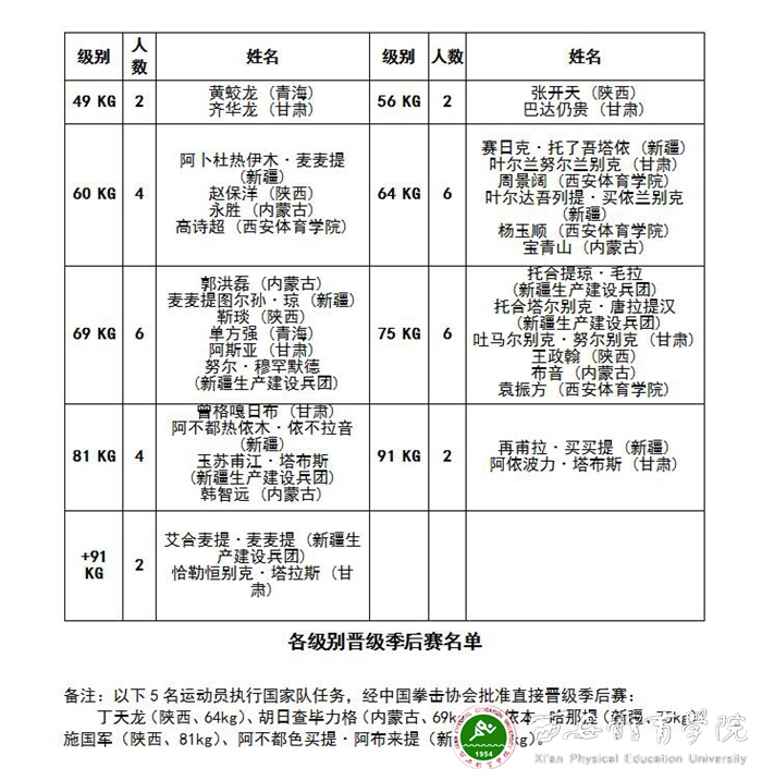 本届比赛,七支代表队发挥都非常出色,经过激烈争夺,最终决出了34个晋级全国总决赛的名额。其中,东道主陕西(包括陕西代表队及西安体育学院代表队)共有10名选手进入决赛。他们是:张开天(陕西,56kg,西北赛区56公斤级冠军)、赵保洋(陕西,60kg,西北赛区60公斤级亚军)、高诗超(西安体育学院,60kg)、周景阔(西安体育学院,64kg)、杨玉顺(西安体育学院,64kg)、靳琰(陕西,69kg)、王政翰(陕西,75kg)、袁振方(西安体育学院,75kg)。另丁天龙(陕西、64kg)、施国军(陕西、81kg)2名运动员由于执行国家队任务,经中国拳击协会批准直接晋级总决赛。