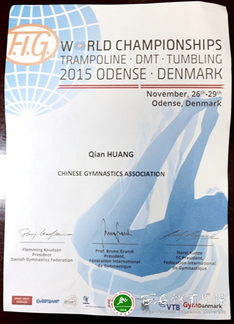 本网讯 第31届蹦床世界锦标赛暨里约奥运会资格赛近日在丹麦的欧登赛市举行。我院黄谦教授受国际体操联合会和国家体操运动管理中心委派代表中国执裁本次比赛。