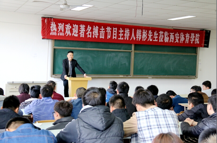 韩彬以自己所主持的节目为出发点,与同学们分享了自己对武术产业化发展的看法。他认为搏击赛事与武打电影是现阶段发展较为成功的文化产业,具有很大的发展空间,希望同学们增强本领,积极参与。他还结合自己从小练武并从中受益匪浅的经历,寄语同学们坚持在武术的道路上走下去。