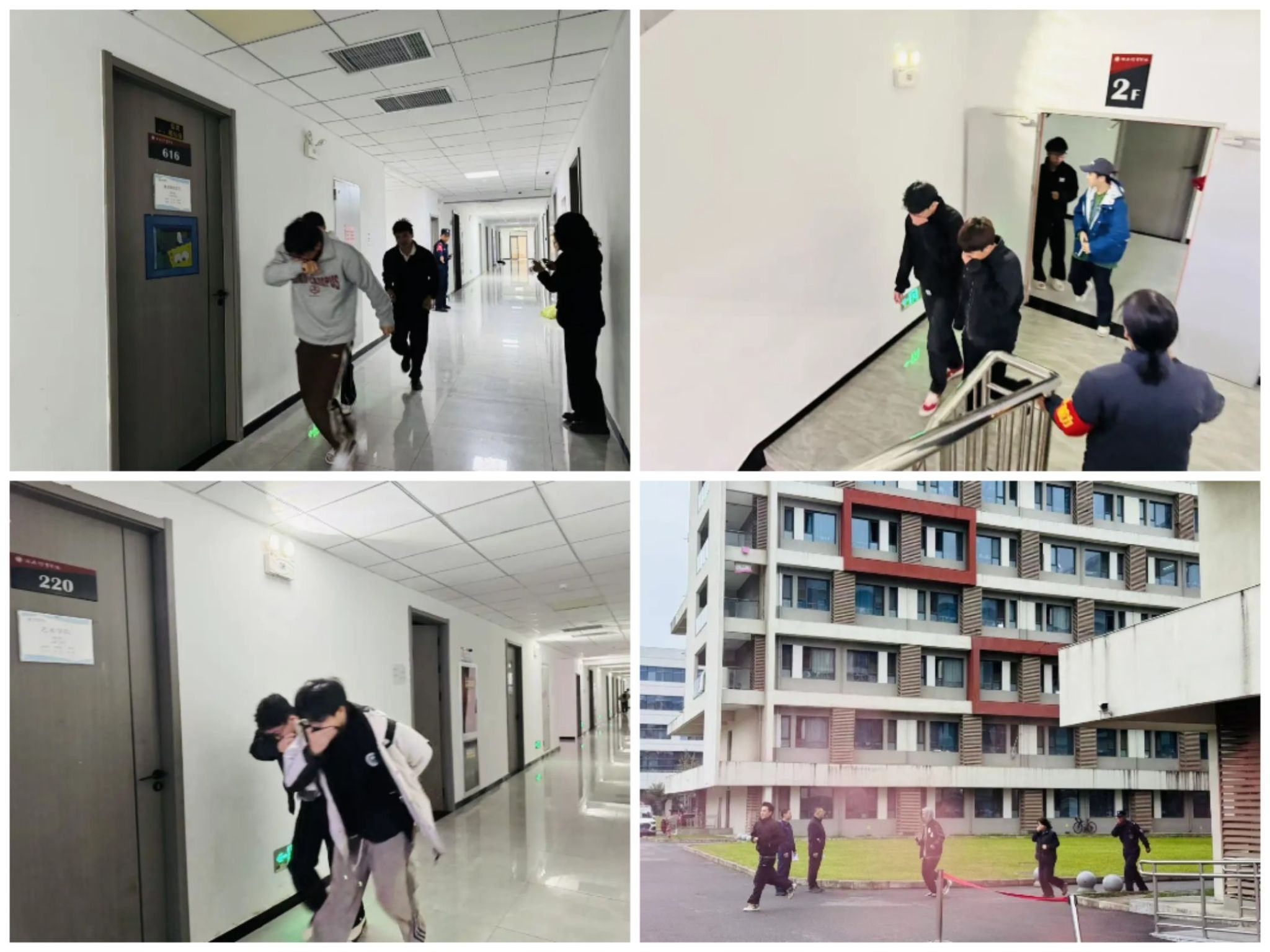 随着疏散指令发出,学生们在辅导员、安保人员等引导下,遵循“先下后上、分层疏散”原则,以湿毛巾捂口鼻、弯腰低姿的规范动作,从1号公寓4个安全出口及两侧消防楼梯有序撤离,错峰分流避免拥堵,快速集结至餐厅东侧、南侧临时集合点,各班级迅速清点人数并上报。