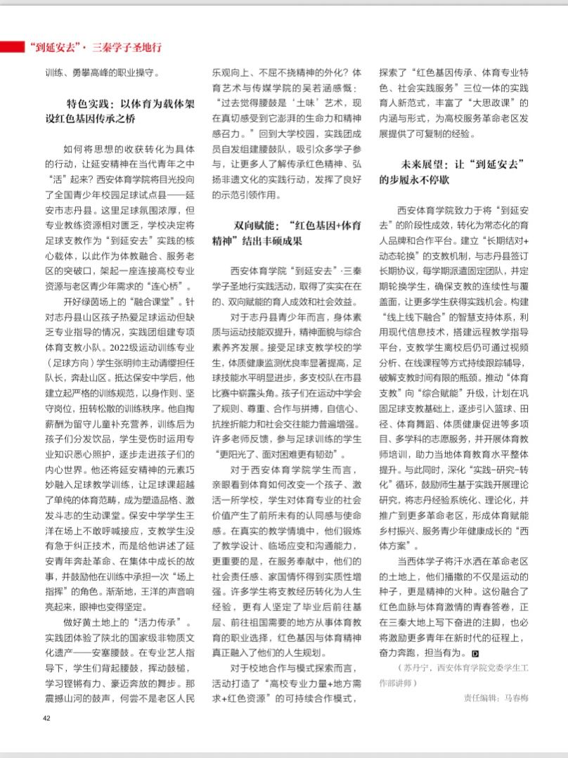 此次成果刊发,既是对西安体育学院“以体育人”特色育人创新探索的充分肯定,也为高校服务革命老区发展、开展“大思政课”建设提供了可复制的“西体经验”。未来,学校继续将红色育人全方位融入人才培养全过程,让红色基因与体育精神在新时代同频共振,推动“到延安去”从阶段性实践转化为常态化育人品牌,书写新时代体育人助力乡村振兴、服务青少年健康成长的奋进篇章。