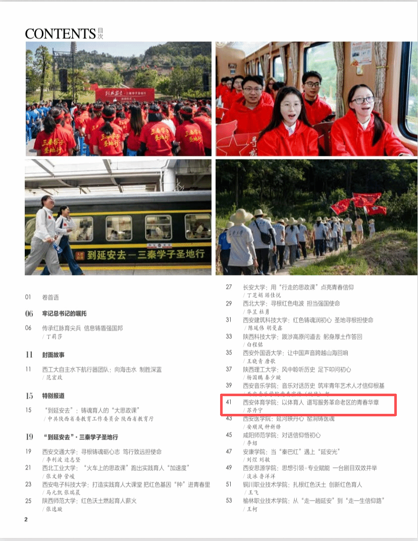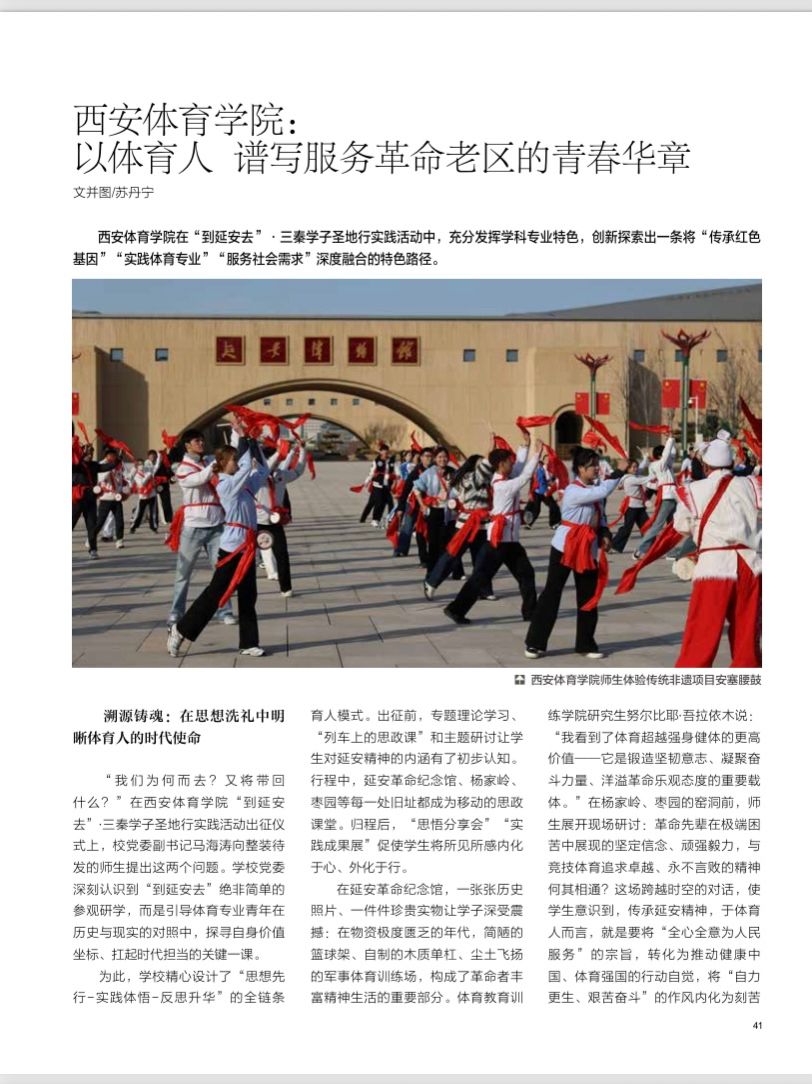 近日,由北京市委宣传部指导、前线杂志社主办的《大学生》杂志2026年3月陕西专刊正式出版,西安体育学院“到延安去·三秦学子圣地行”实践活动成果以《西安体育学院:以体育人 谱写服务革命老区的青春华章》为题全文刊发,系统展现了学校在红色基因传承、体育专业实践与服务社会需求深度融合方面的特色路径与育人成效。