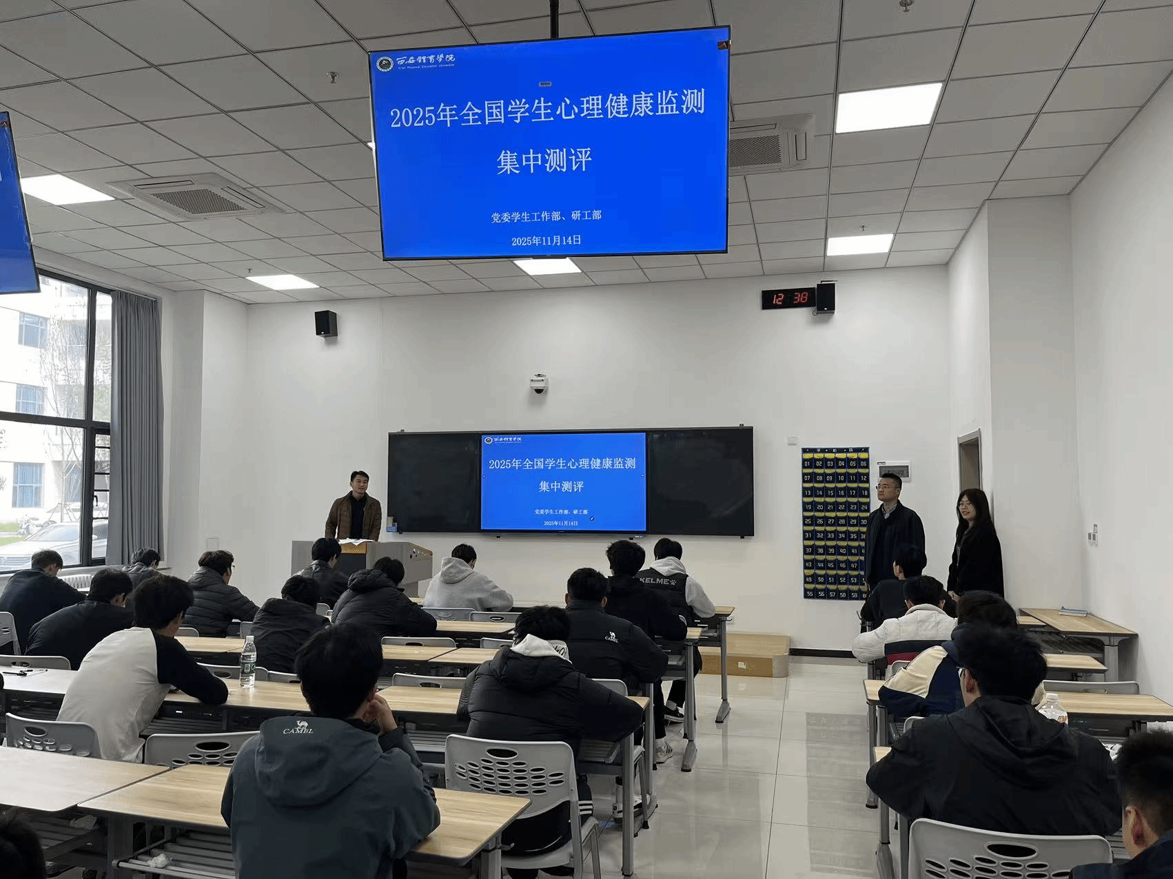 监测当日,省级视导员、西安石油大学心理健康中心专家魏晓言与学工部部长马国华全程督导。测试员严格核验身份、发放匿名账号;信息团队实时保障网络与设备稳定;心理健康教师全程待命应对突发情况。参测学生认真作答问卷,教师组独立完成专业评估,现场纪律井然,数据采集科学有效。
