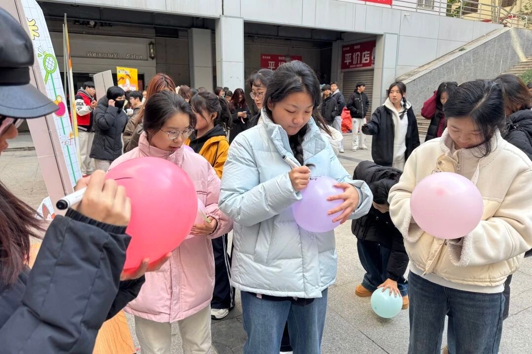 成为大家释放压力的“快乐驿站”。同学们拿起马克笔,将烦恼轻轻写在气球上,随着“3、2、1”的呼喊声,大家欢声笑语取代了焦虑愁绪;一旁的微笑打卡墙前,大家摆出搞怪又治愈的姿势,用镜头定格此刻的轻松与喜悦,让快乐在快门声中无限传递。