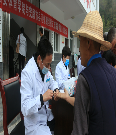 2021年11月18日,由运动健康科学学院党委书记刘勇带队,西安运动创伤医院内科、外科、骨伤科、五官科医生及护理等七名医务人员携带超声、心电图,血糖仪等仪器设备前往安康市县河镇谢坝村,为村民进行义诊活动。