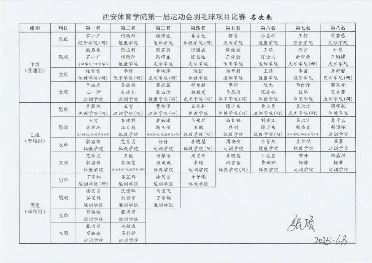 运动训练学院 2024 级学子在此次羽毛球项目中的优异表现,是他们日常刻苦训练的成果,也彰显了运动训练学院在体育人才培养方面的卓越成效。期待运动训练学院2024级学子在未来的体育赛事中,继续发扬拼搏精神,创造更多的辉煌,为运动训练学院2024级争光添彩。