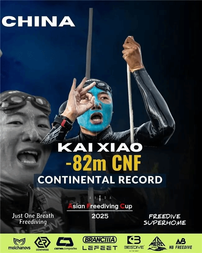 2025年6月8日—— 在菲律宾邦劳岛上举办了自由潜水亚洲杯(Asian Freediving Cup),中国运动员肖凯在此次比赛中上演了震撼人心的一幕。在最具挑战性的男子CNF(恒重无蹼)项目中,他连续三次下潜,以77米、80米和最终定格在82米的惊人深度,三次刷新亚洲纪录!这不仅让他成为该项目无可争议的新亚洲纪录保持者,更使他成为亚洲首位在同一赛事中三破洲际纪录的自由潜水运动员。