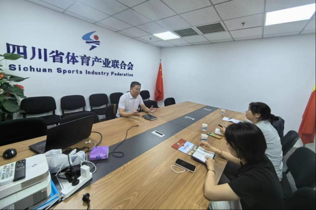 第三站抵达四川省体育产业联合会,丁惠坚秘书长介绍了联合会在体育产业整合、赛事举办及产教结合等多方面的详尽情况,并分享了体育产业数字化转型的案例。交流结束后,郭书记表达了与联合会在产学研方面合作的愿望,以便发挥各自社会责任,共同促进学生就业市场的发展。