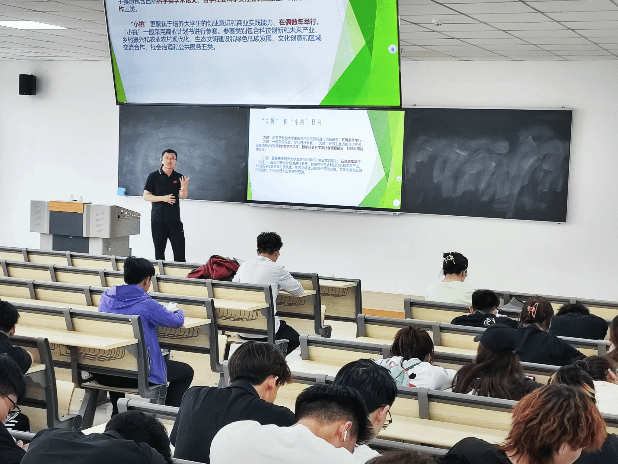 2025年5月9日12:30,运动休闲学院在教学楼308教室开展“挑战杯”大学生创新创业项目申报专题辅导讲座。本次活动特邀西安体育学院副教授、科创竞赛资深导师张志勇担任主讲,近百名学生到场聆听,现场学习氛围热烈。