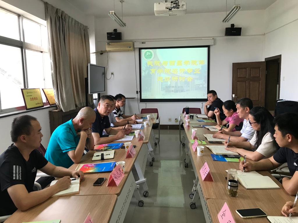 6月1日下午2: 30在综合训练馆六楼会议室,运动训练学院与西昌学院体育学院召开专业建设交流会。主要参会人员有西昌学院体育学院院长刘志刚、副院长郎朝春、体育教育教研室主任刘吉峰、科研秘书王强、教师谢志民、教师王泽刚;运动训练学院党政领导班子成员、办公室成员、各教研室主任和书记。本次会议由副院长郑峰主持。