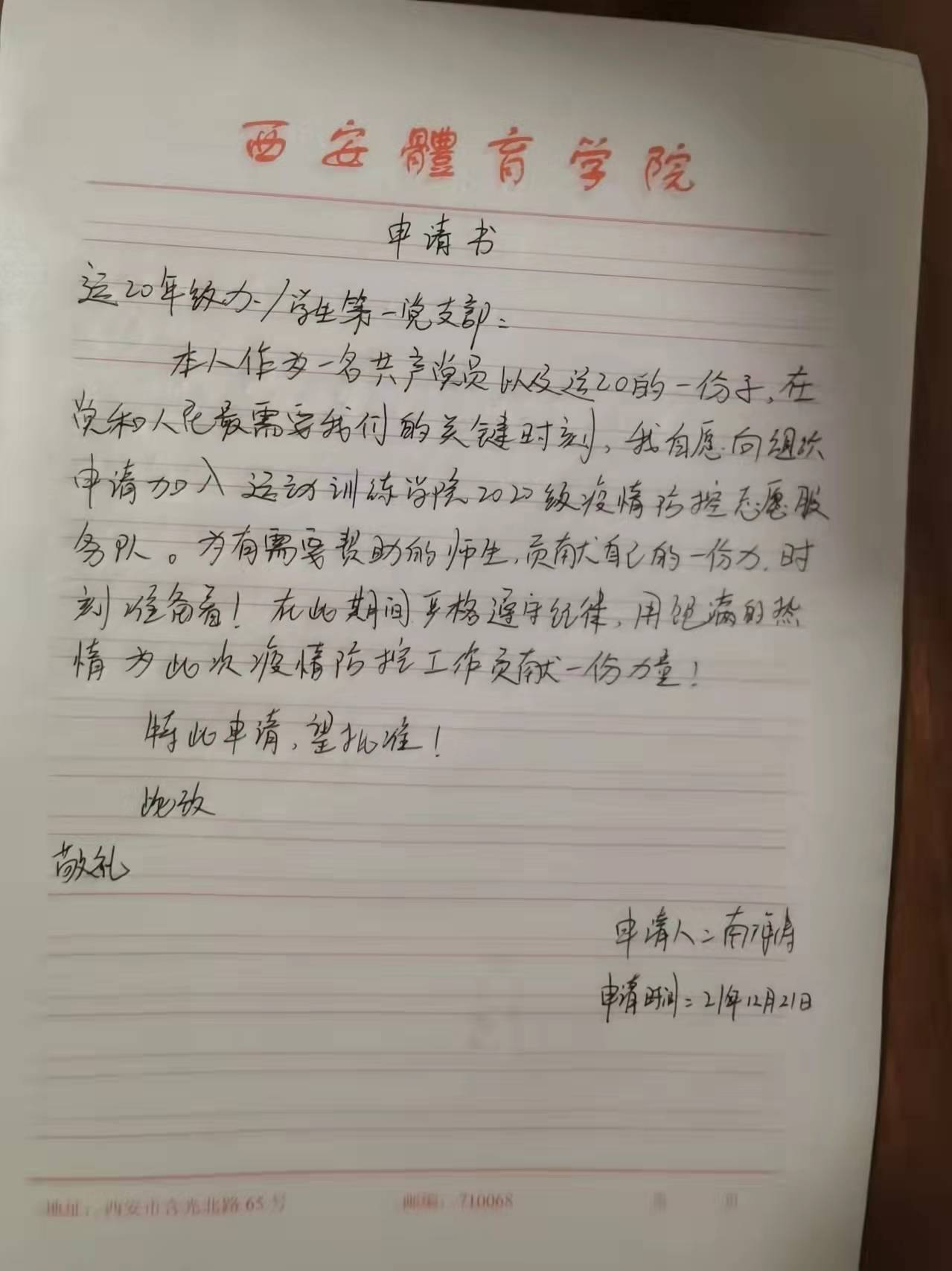 数九寒冬暖人心。疫情发生后,学院领导特别关注和关心被隔离的教师,我院教师吴洁老师被隔离后,党委书记王鑫每天与吴老师通话,主动关心问候,及时心里开导;党委组织员宋文杰老师时刻挂念在鄠邑校区值守的教师,在解除隔离后,想办法自费为鄠邑校区老师购买相关物资;同时学院为有困难的教师随时做好服务。运动训练学院学生主动请缨,自愿申请加入疫情服务志愿队,他们有的在核酸检测现场维持秩序,有的在为隔离学生送水送餐。与此同时,一封封志愿申请书也源源不断的递交到年级办公室,它们像一阵阵暖流,融化着疫情寒冬下的冰雪。截止目前,年级办已收到160多份申请书,这个数字还在不断增加。年级办就志愿者报名人数立即成立了三个志愿小分队,随时待命,为校区和学生提供服务。