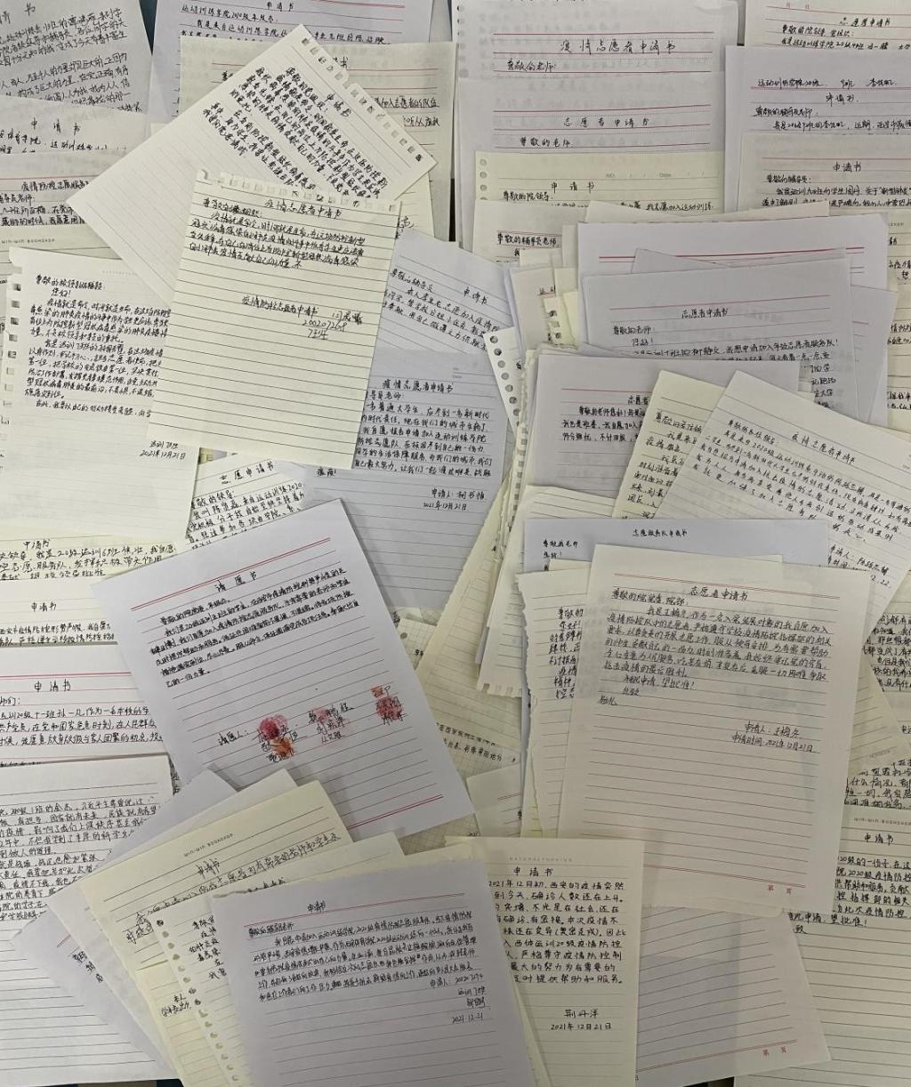 面对愈发严峻的疫情形势,西安市实施疫情防控提级管理,全面加强管控措施。为积极响应学校疫情防控工作部署,深刻贯彻落实学校有关文件精神,运动训练学院2020级师生团结一心,共同抗疫,迅速组建抗疫志愿服务队,筑起抗疫坚强堡垒。倡议书一经发出,同学们踊跃报名,奋勇争先,那一封封请战书带着青春热血,响应号召,勇于担当,积极行动,奉献青春力量,他们说战“疫”我们不能缺席,志愿加入防疫工作第一线。小小的纸张承载着铮铮的铁血誓言,朴实而有力的战书,体现着坚守与担当。疫情就是命令,他们用行动回应着“请党放心,强国有我”的祖国号召。截止目前已有160余名同学加入到这支抗疫队伍中。他们在本次疫情防控中冲锋在前,激扬青春,点亮战“疫”光芒,守护平安校园。