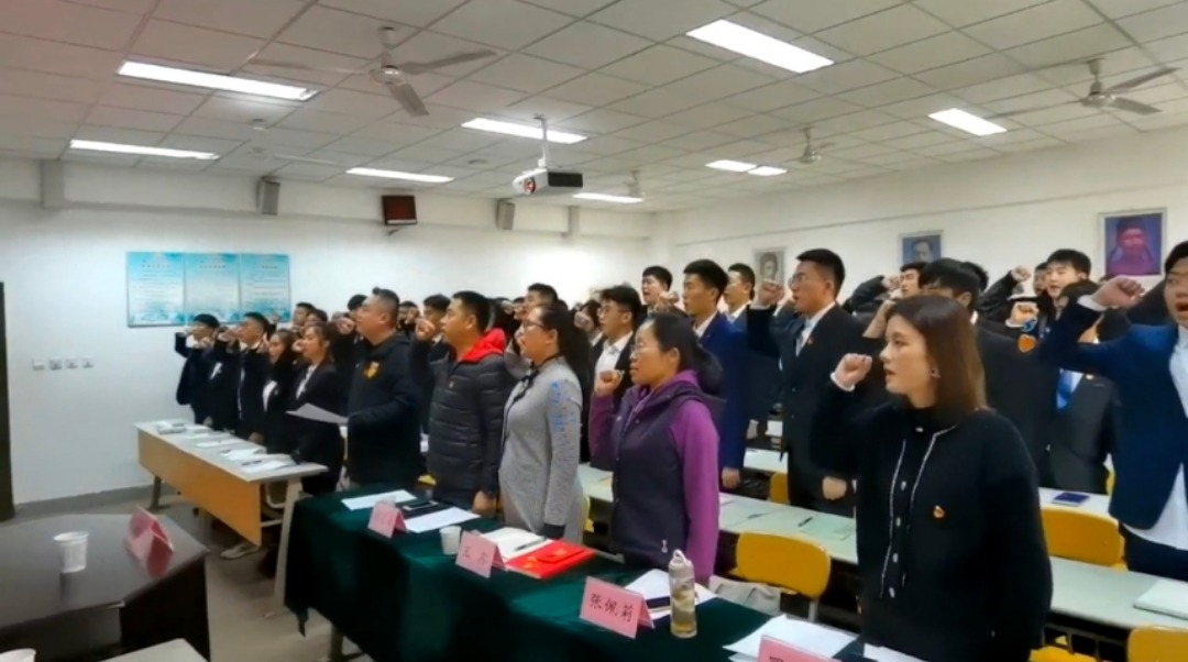 全体党员教师以及学生第二党支部的党员、预备党员和入党积极分子一同观看学习了十九届六中全会重要指示精神纪录片,观看结束后,全体人员进行了重温入党誓词的庄严的宣誓活动。