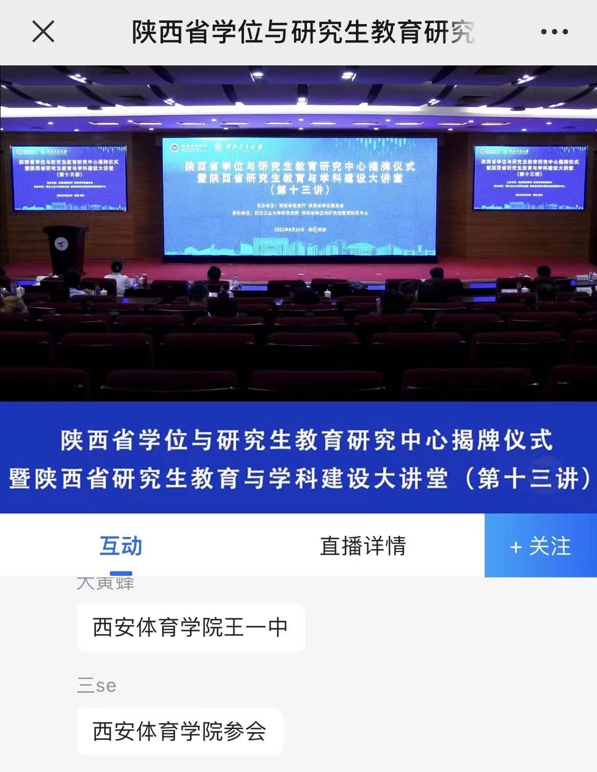 2022 年 6 月 23 日在西北工业大学友谊校区国际会议中心举行陕西省学位与研究生教育研究中心揭牌仪式暨陕西省研究生教育与学科建设大讲堂 (第十三讲)。本次采取视频会议形式进行,主会场设于西北工业大学。西安体育学院校领导、研究生部全体导师、全体工作人员以及全体研究生出席本次线上报告会。