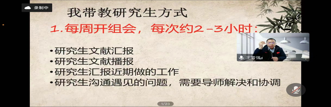 在近两个小时的线上讲座中,王教授主要围绕师生双向选择、研究生的科研与生活、老师的工作总结与新年规划三个方面进行分享:(1)师生关系的双向选择:如选择学生时注重性格、科研态度、创新精神等方面;同时学生也需要有一个明确的读研规划。(2)研究生的科研与生活:王教授强调培养研究生尤其要注重自主学习能力、系统的科研训练以及严密的科研思维等方面的培养。(3)老师的工作总结与新年规划:通过总结过去一年的科研成果、实践收获来为下一年的工作做好准备,这对导师和学生来说都同等重要。