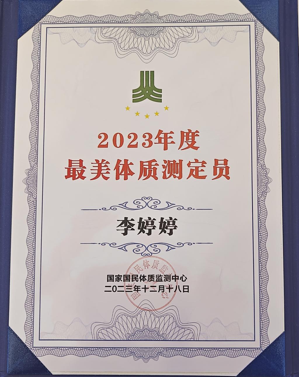 近日,由国家国民体质监测中心主办的2023年常态化国民体质监测工作技术培训及常态化体质检测总结会中,我校在读研究生李婷婷被评为“最美体质测定员”。