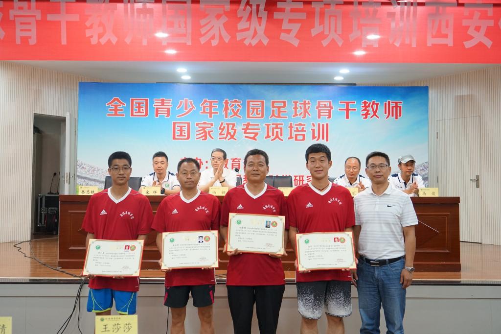 7月15日,为期9天的2018年全国青少年校园足球骨干师资国家级专项培训西安体育学院培训班顺利结束。足球学院院长朱军、首席专家杨钢、足球教研室主任席海龙、副主任马俊,以及多位足球教研室教师参加了结业典礼。与会领导分别为此次培训班优秀学员、优秀班干部颁发了证书并合影留念。