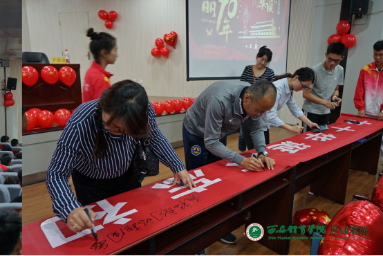 西安体育学院足球学院于2019年9月29日举行盛大的“祝福祖国七十华诞”签名仪式。足球学院党总支书记姜梅,副院长席海龙,教研室副主任马俊,办公室主任岳志铁,交流中心主任张芬,辅导员李阳等出席了本次仪式。办公室主任岳志铁老师负责主持。